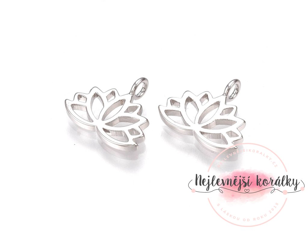 Mosazný přívěsek - rhodiovaný - lotosový květ - 10,5 x 12,5 x 3 mm - 1 ks