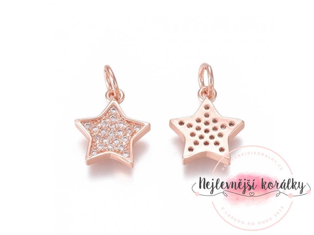 Mosazný přívěsek s kubickými zirkony - hvězda - růžově zlatý - 12 x 10 x 2 mm - 1 ks