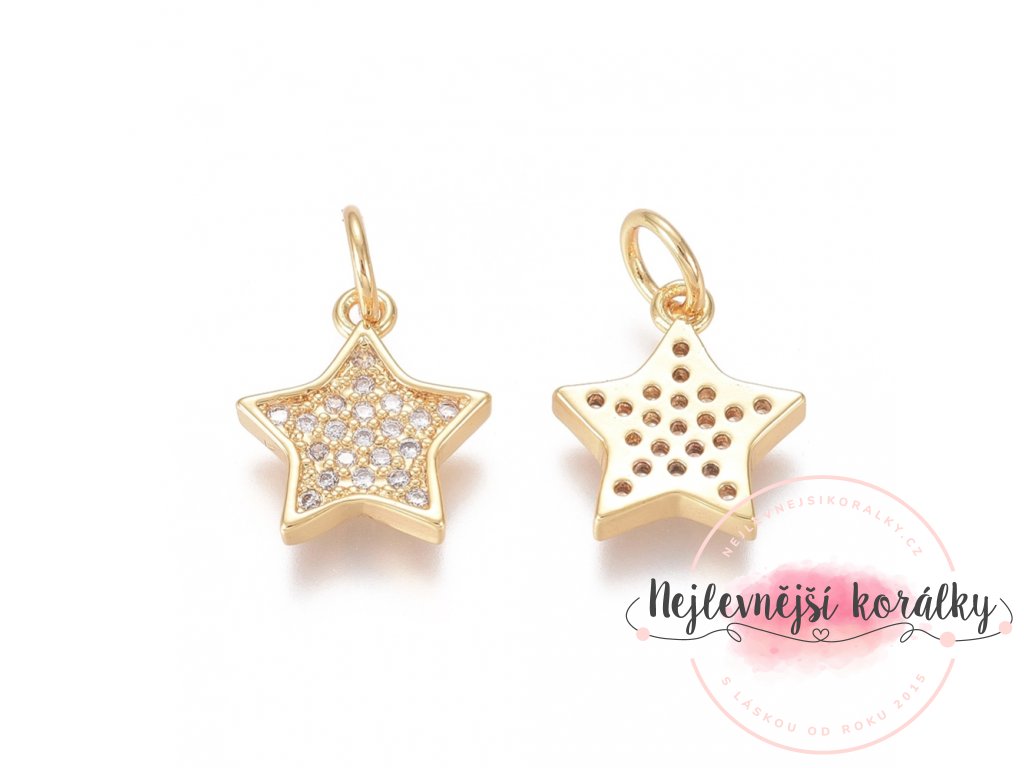 Mosazný přívěsek s kubickými zirkony - hvězda - zlatý - 12 x 10 x 2 mm - 1 ks