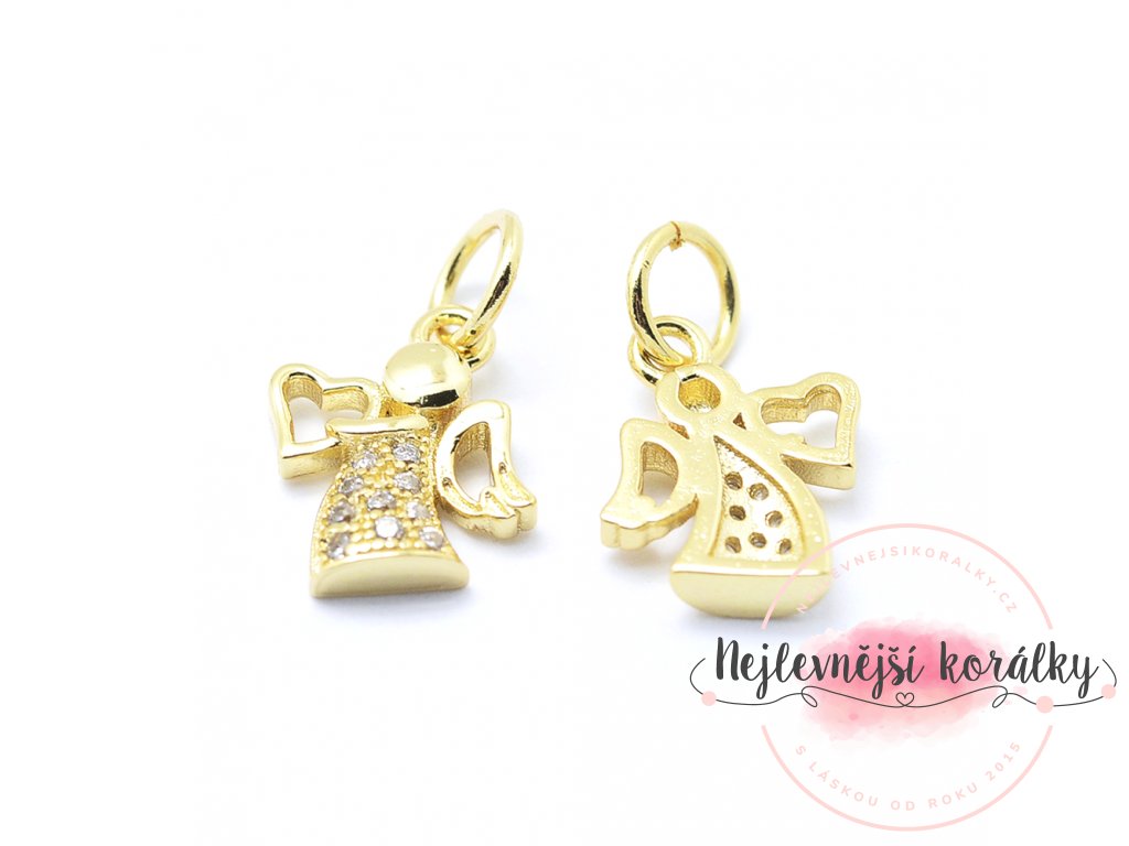 Mosazný přívěsek s kubickými zirkony - zlatý - anděl - 12 x 9,5 x 2 mm - 1 ks