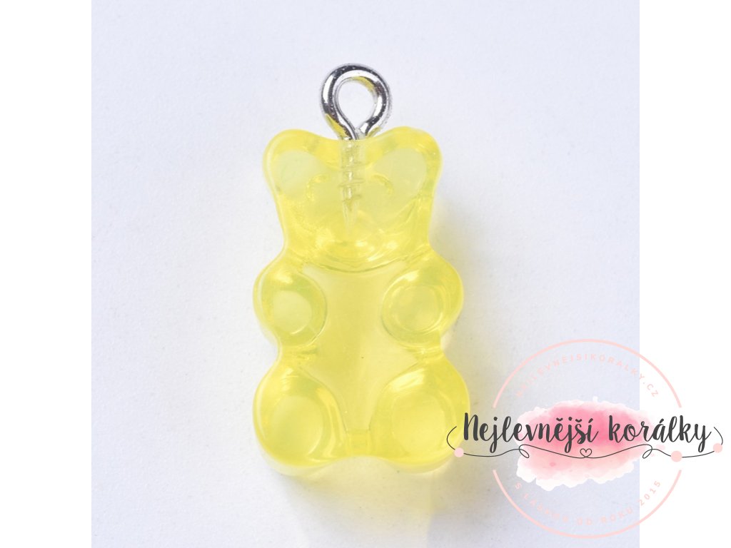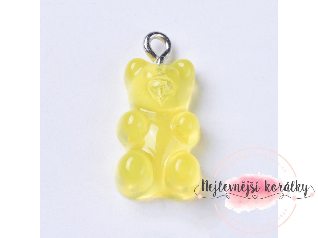 Přívěsek ve tvaru žlutého gumového medvídka o výšce 21 mm, šířce 11 mm a hloubce 6 mm.