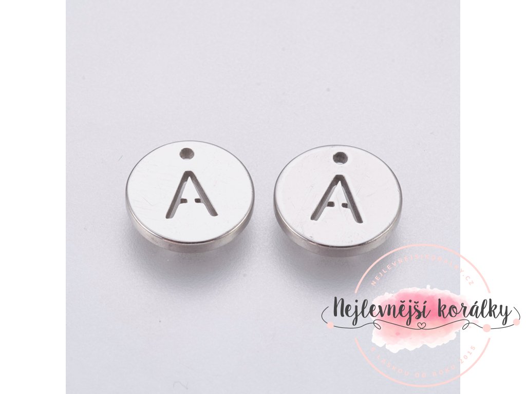 Kvalitní přívěsek ve tvaru placičky s písmenem "A" o průměru 10 mm, hloubce 1 mm s velikostí průvleku 1 mm.