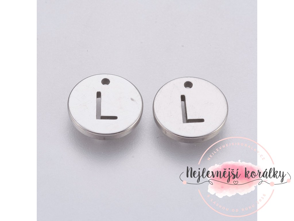 Kvalitní přívěsek ve tvaru placičky s písmenem "L" o průměru 10 mm, hloubce 1 mm s velikostí průvleku 1 mm.