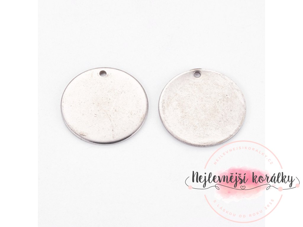 Kvalitní přívěsek ve tvaru placičky o průměru 20 mm, hloubce 1 mm s velikostí průvleku 1 mm.
