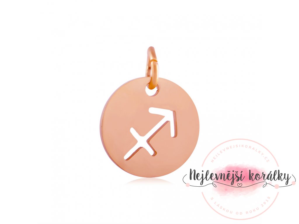 Přívěsek v růžově zlatém provedení s vyobrazeným znamením zvěrokruhu Střelce je vyroben z nerezové oceli typu 304.