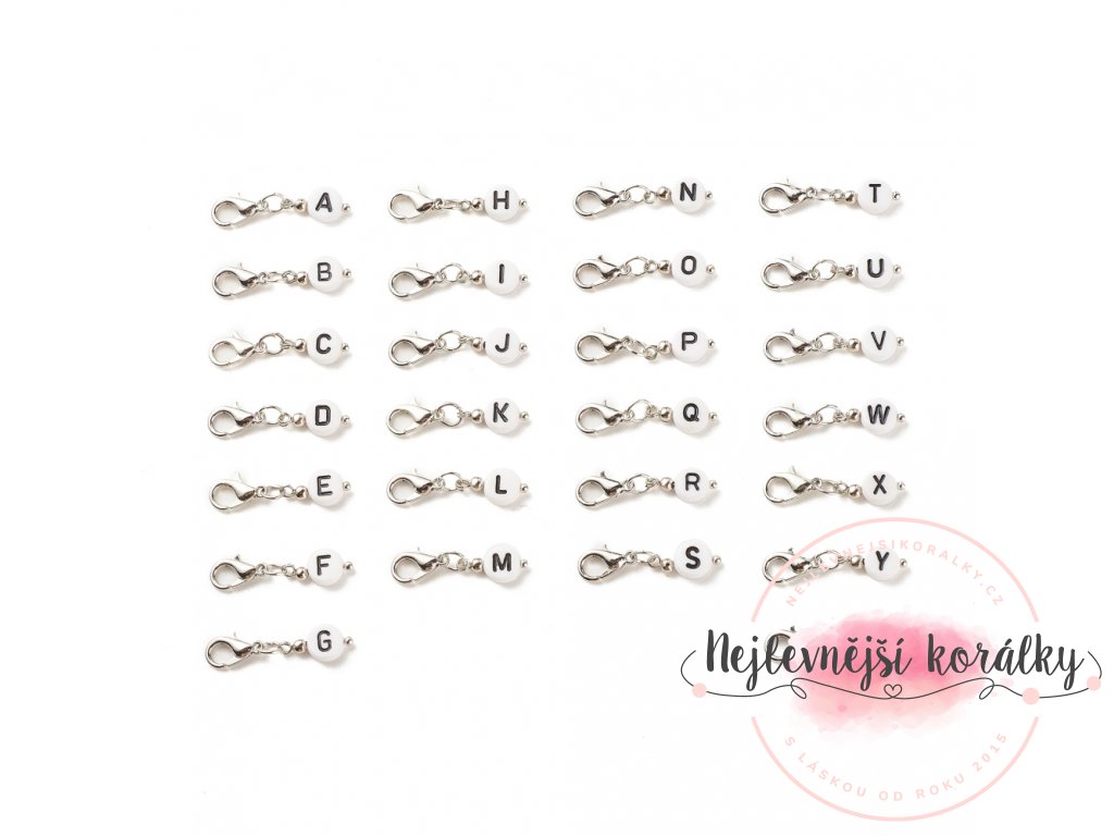 Sada obsahuje 26 kusů přívěsků s karabinkou a písmenkem abecedy.