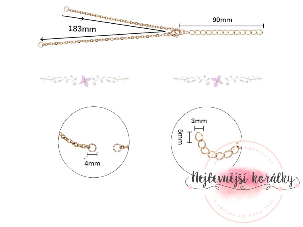 Řetízek o celkové délce cca 18,5 cm a šířce cca 2 mm je vybaven praktickou karabinkou a očkem, což zaručuje snadné zapínání a pohodlné nošení.