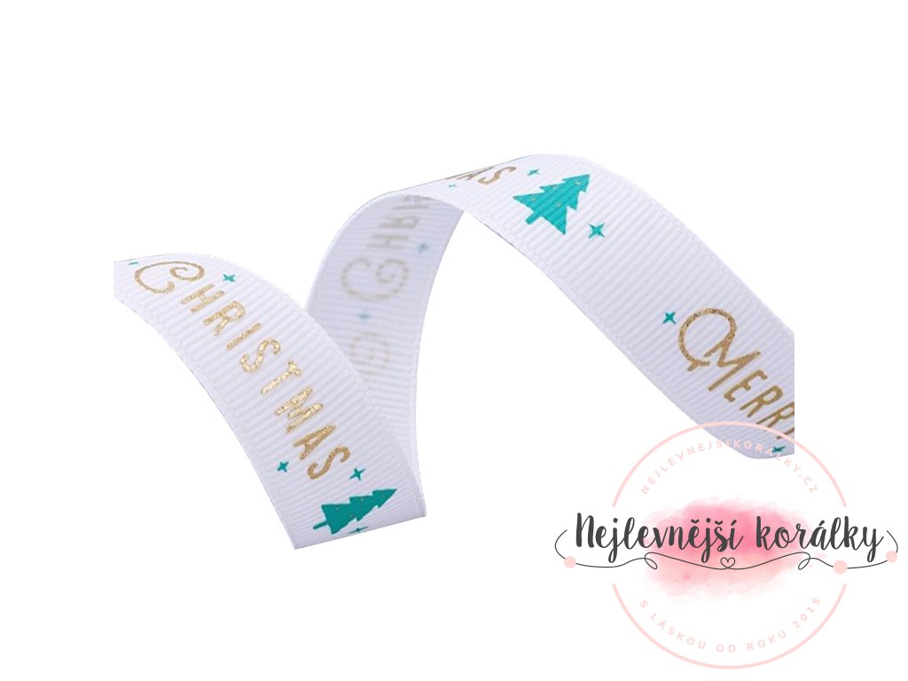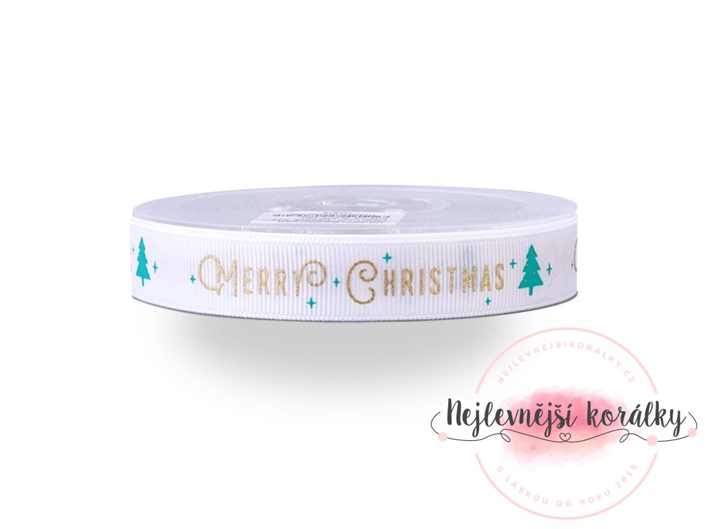 Rypsová stuha v bílém provedení se zlatým nápisem Merry Christmas – "Veselé Vánoce" a potiskem zelených stromečků o šíři 16 mm a délce 1 metr.