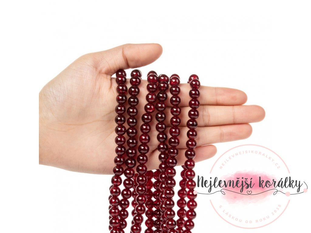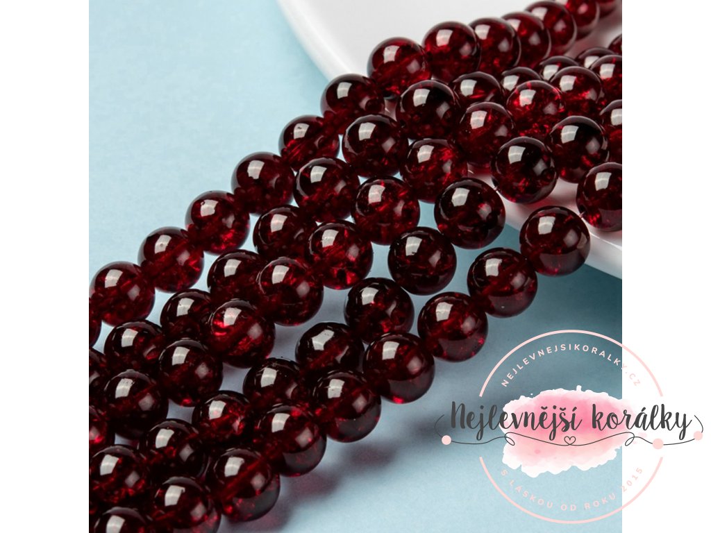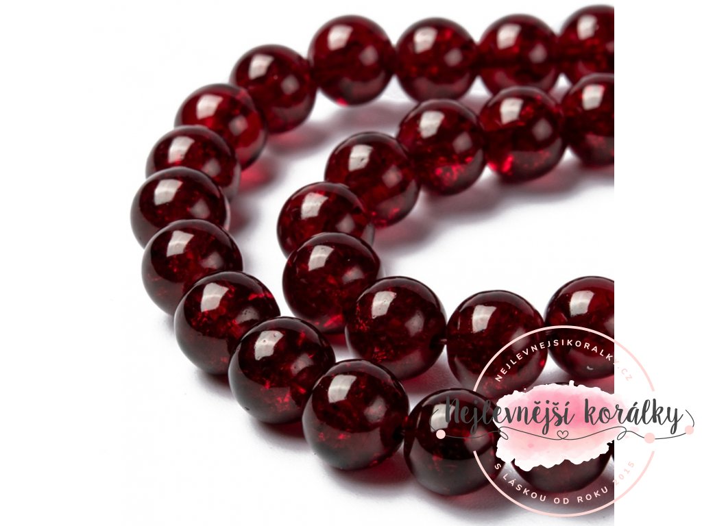 Praskané korálky v tmavě červeném provedení o velikosti 8 mm s velikostí průvleku 1,3 ~ 1,6 mm.