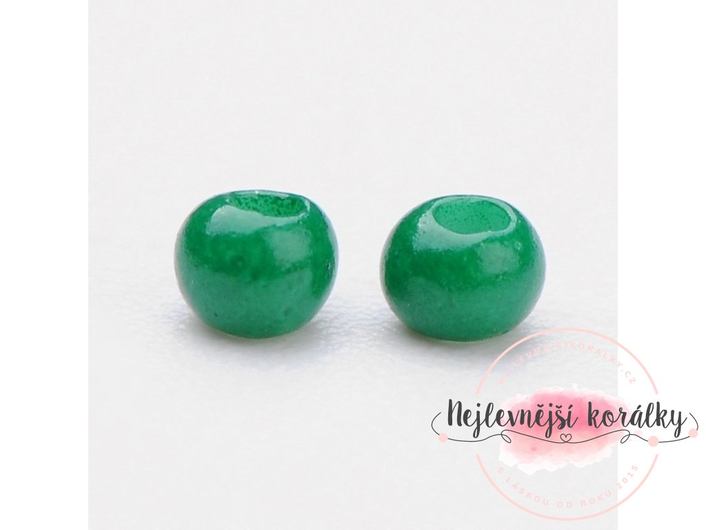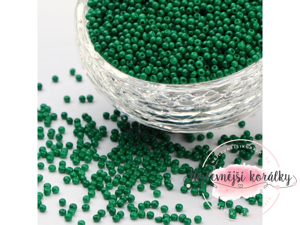 Skleněný rokajl třídy A v olivově zeleném provedení o šířce 2 mm, výšce 1,5 mm s velikostí průvleku 0,3 mm.