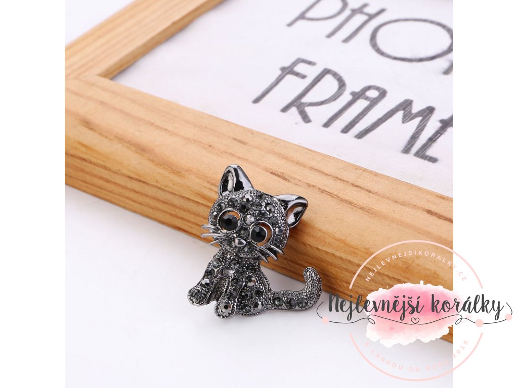 Brož ve tvaru kočky s kamínky, tmavý kov