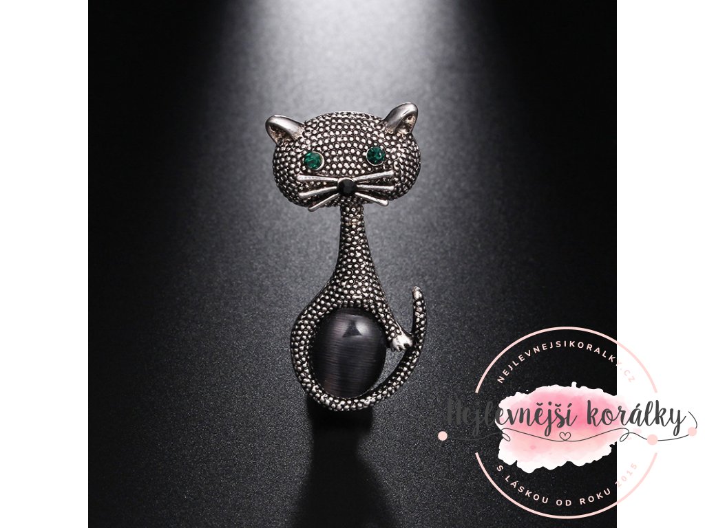 Brož ve tvaru kočky – černý opalit & kamínky, starostříbrná