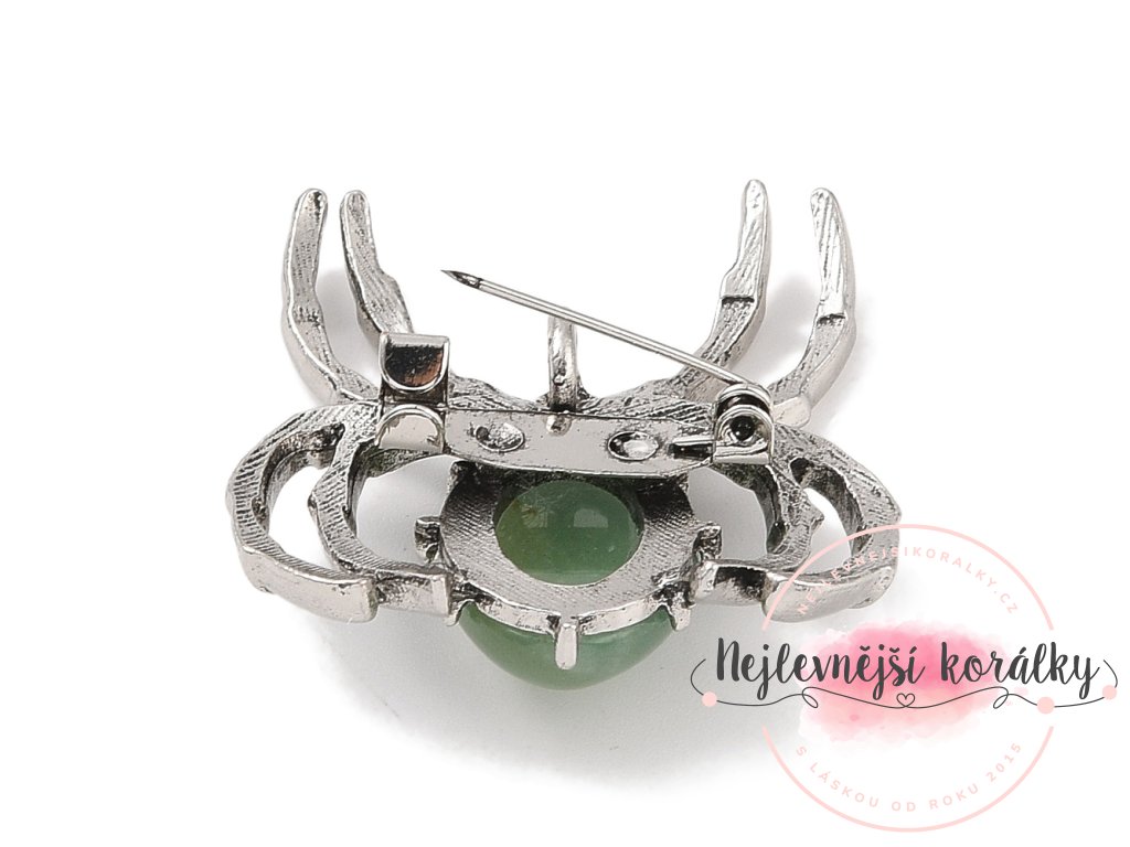 Kovová brož / přívěsek - Pavouk s avanturínem - starostříbrná - 34 × 37 mm - 1 ks