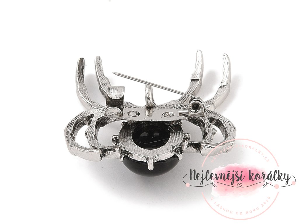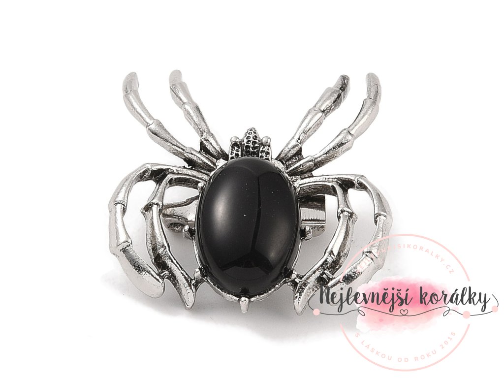Kovová brož / přívěsek - Pavouk s obsidiánem - starostříbrná - 34 × 37 mm - 1 ks