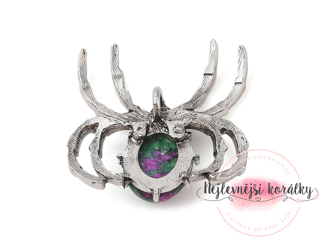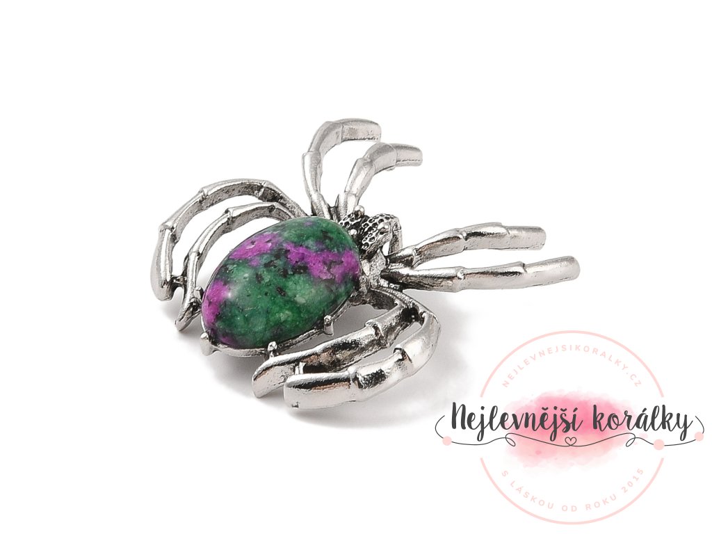 Tělo pavoučka tvoří zajímavá kombinace zeleného zoisitu s přirozenými rubínovými akcenty – každý kámen je originál. Antik stříbrný kovový základ zdůrazňuje výraznou strukturu a kontrast mezi barvami.