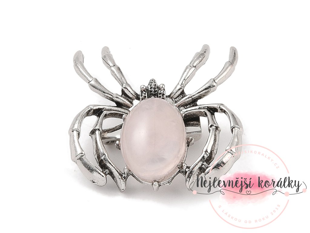 Tělo pavoučka tvoří přírodní růženín – kámen lásky, něhy a harmonie, který svou světle růžovou barvou dodává broži elegantní a romantický nádech. Kovová část v antik stříbrné úpravě krásně kontrastuje s jemným tónem kamene a zvýrazňuje detaily zpracování.