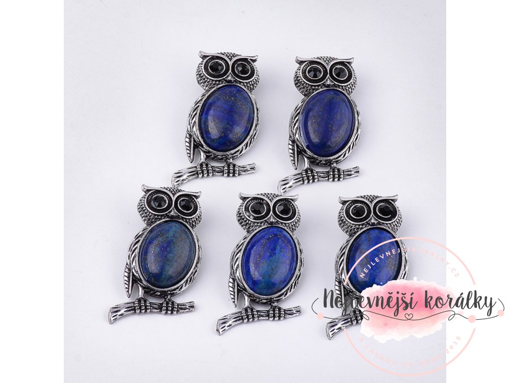 Kovová brož / přívěsek - Sova s lapisem lazuli - starostříbrná - 51 × 29 mm - 1 ks