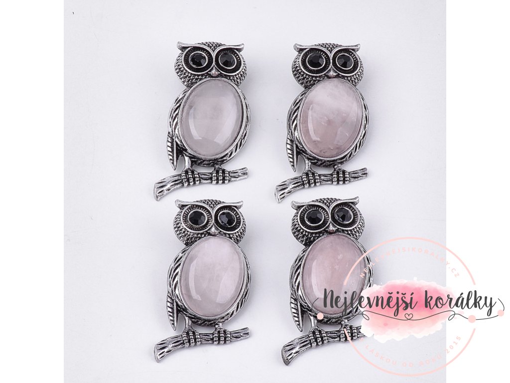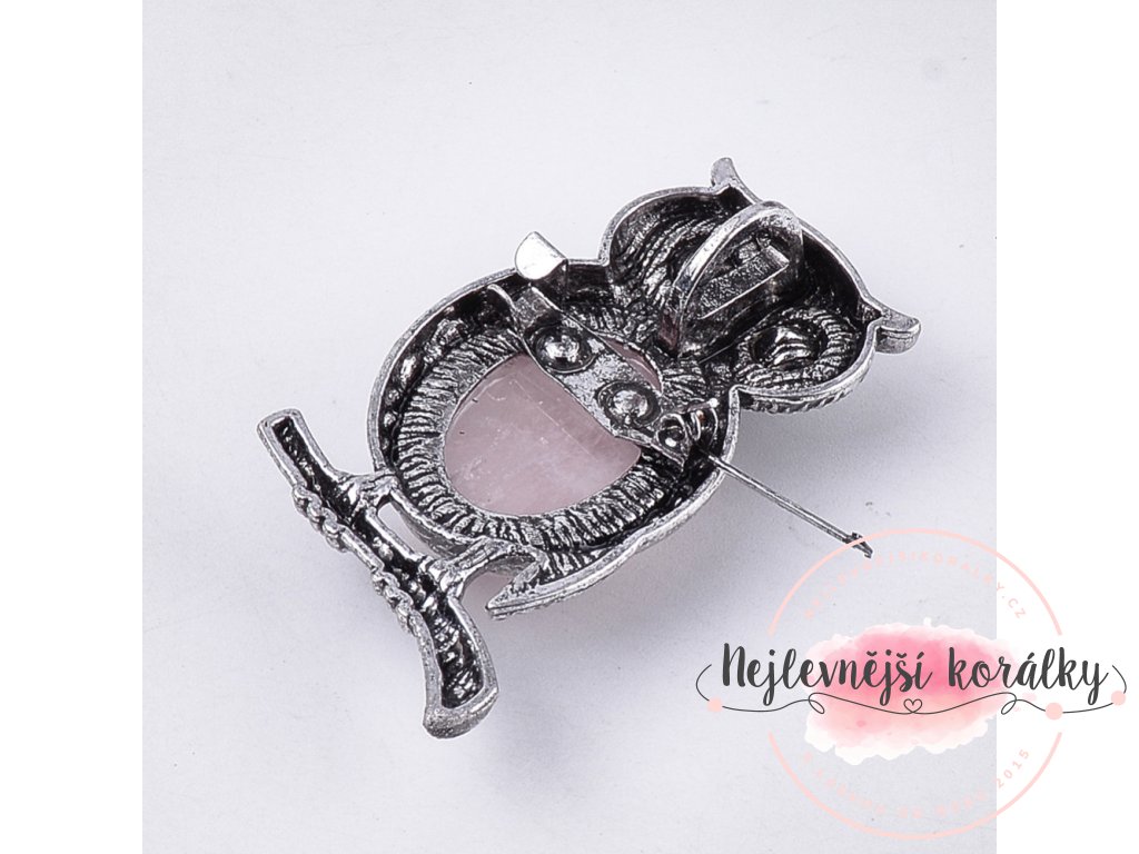 Brož / přívěsek sovička s růženínem – přírodní kámen, kamínky, starostříbrná