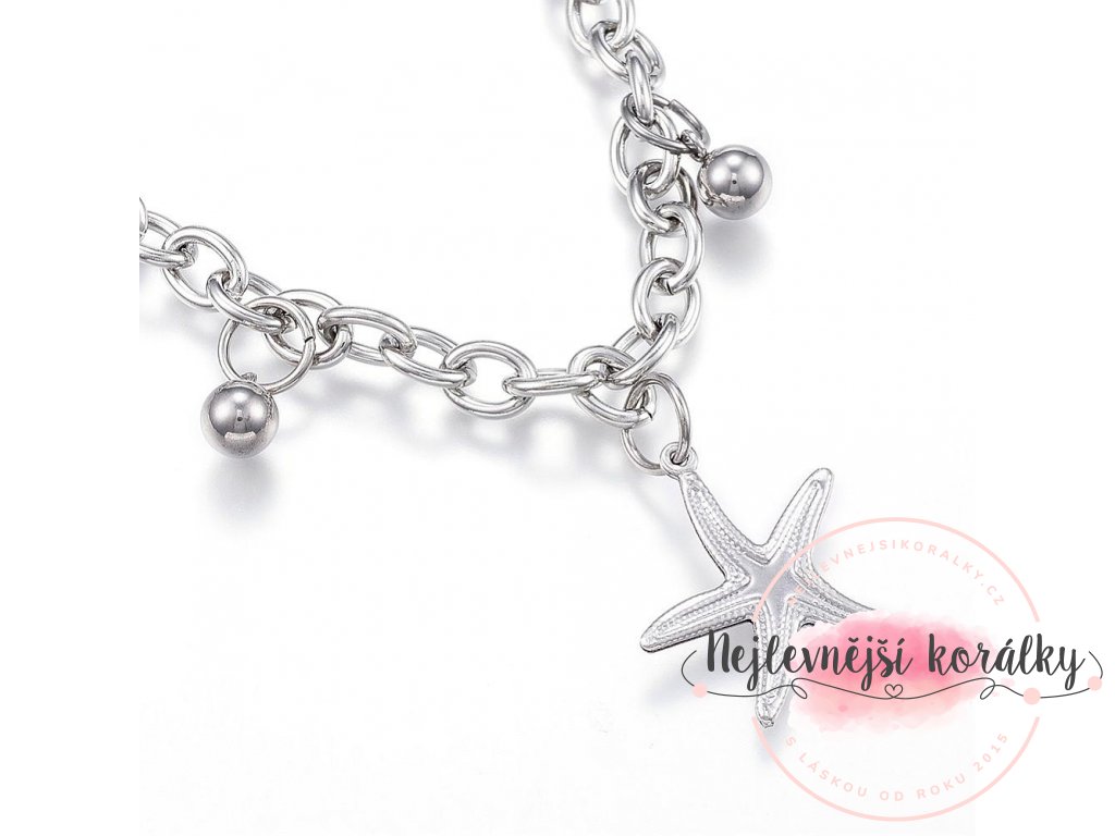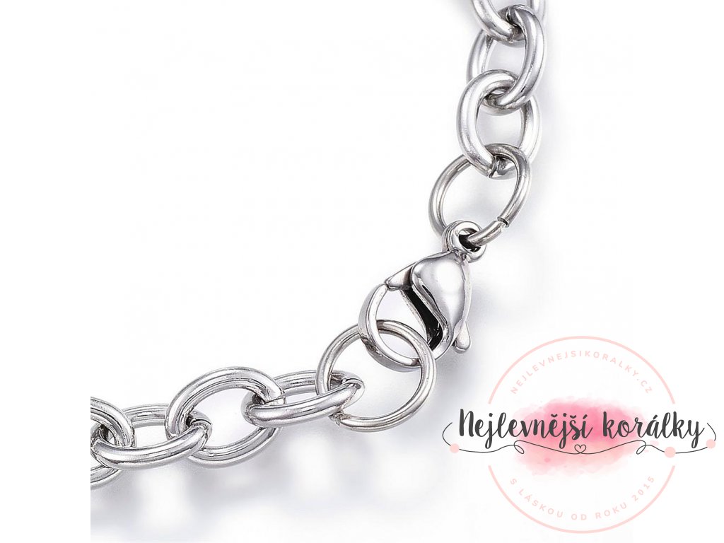Náramek je nastavitelný. Řetízek z nerezové oceli je hypoalergenní a voděodolný.