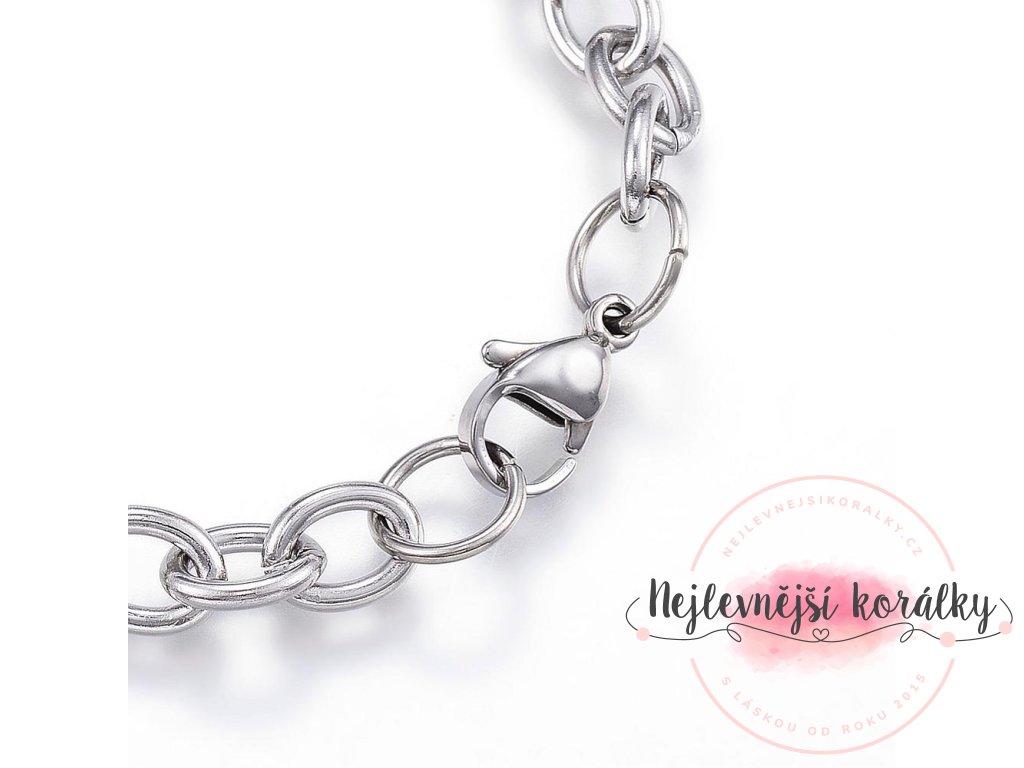 Náramek je nastavitelný. Řetízek z nerezové oceli je hypoalergenní a voděodolný.