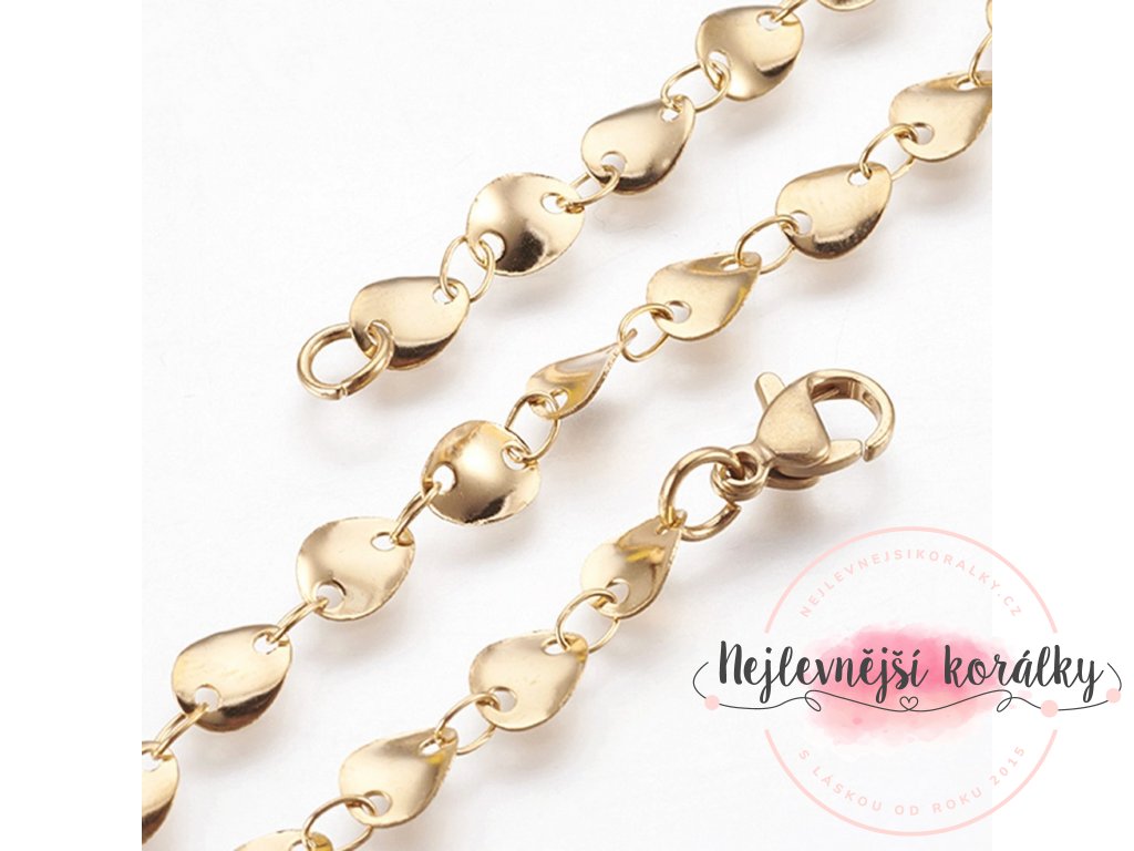 Náramek z plíšků o délce 19,5 cm je vyroben z nerezové oceli typu 304 ve zlatém provedení.
