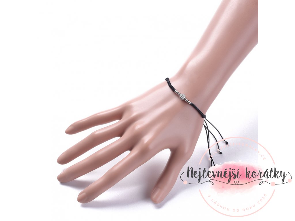 Šňůrkový náramek z nylonové šňůrky v černém provedení je zdoben korálky v platinové barvě, mezi nimiž vyniká mosazný korálek s kubickými zirkony.