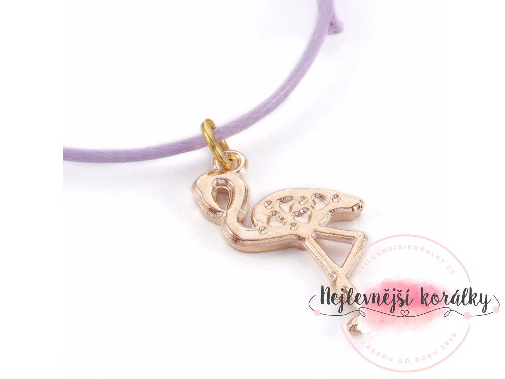 Náramek je vyroben z bavlněné povoskované šňůrky s přívěskem zlatého plameňáka z bižuterního kovu s růžovým zbarvením.