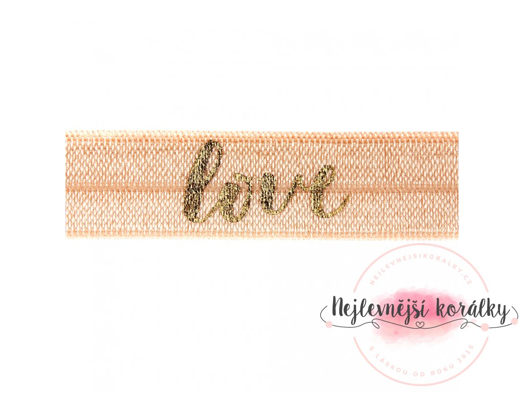 Lemovací pruženka v meruňkovém provedení s zlatým nápisem "love" o šířce 15 mm.