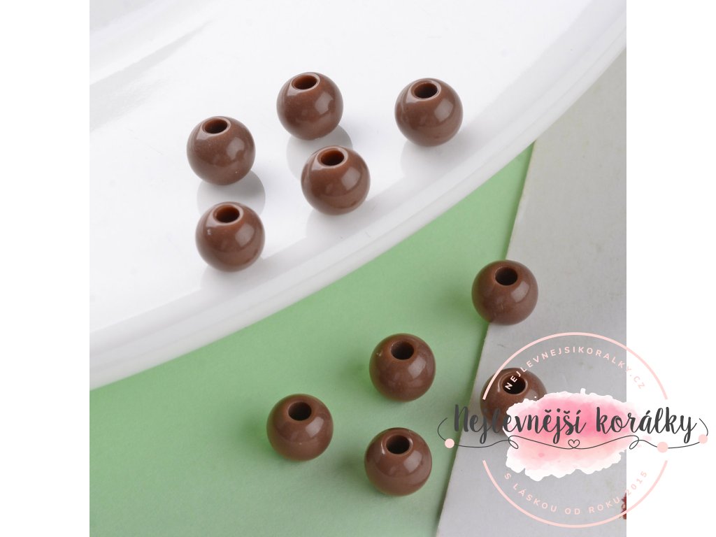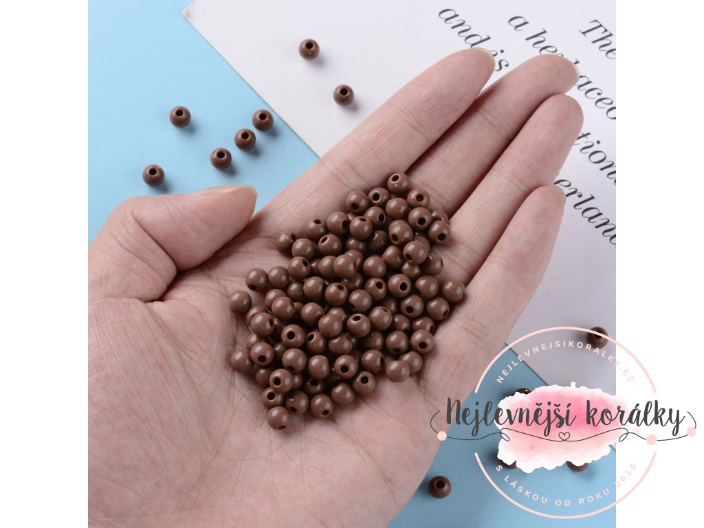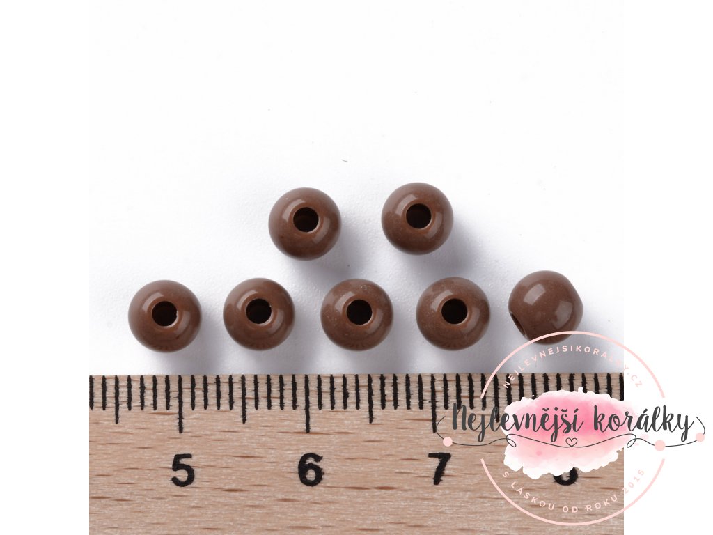 Akrylové korálky v hnědém provedení o velikosti 6 mm s velikostí průvleku 1,8 mm.