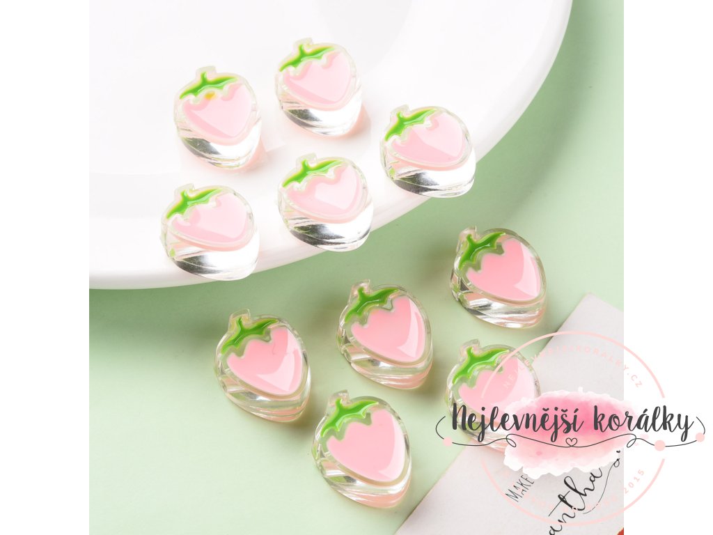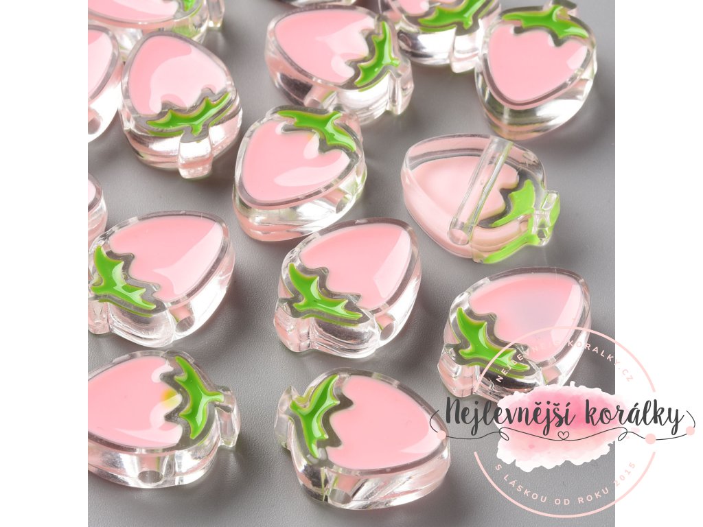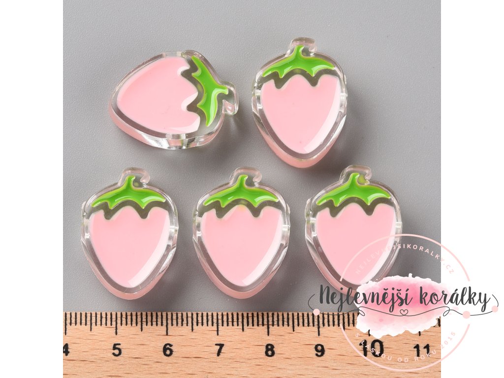 Akrylové korálky ve tvaru jahůdky v pudrově růžové barvě o velikosti 25,5 x 19 x 9 mm s velikostí průvleku 3,5 mm.