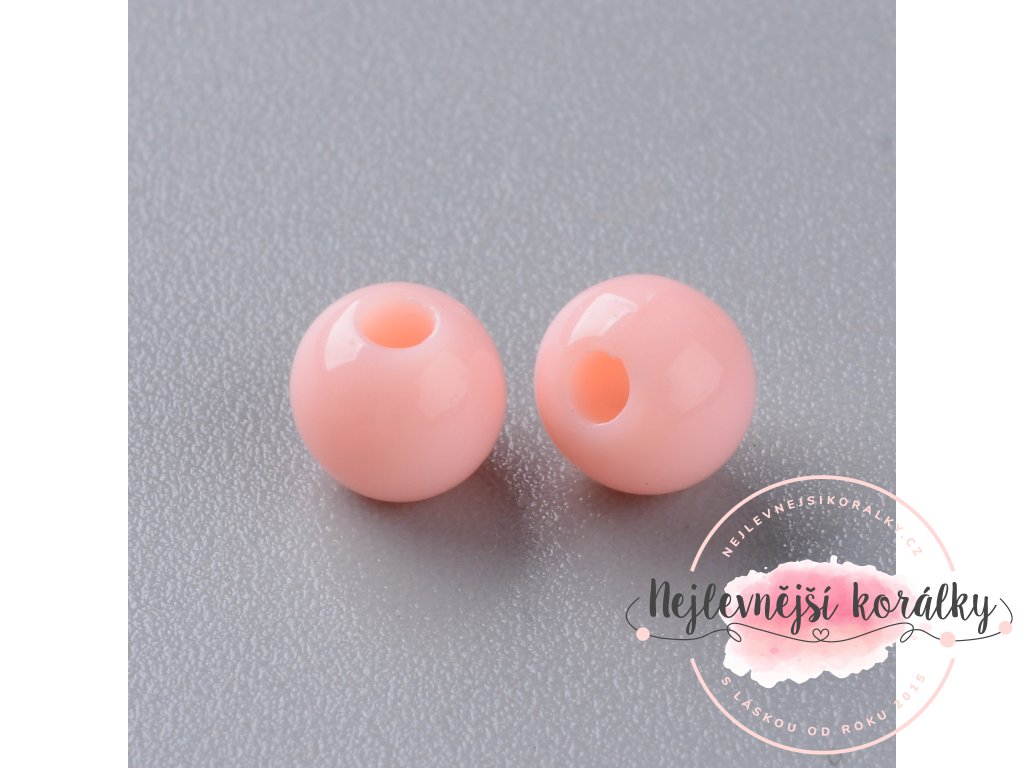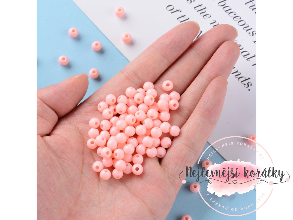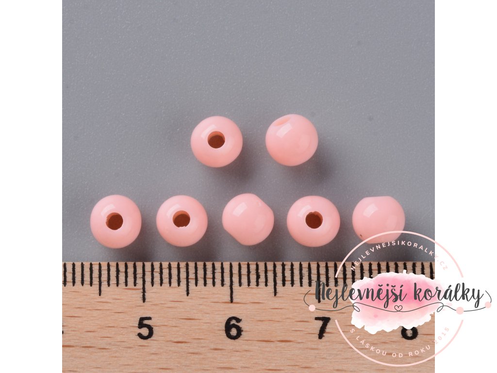 Akrylové korálky v lososově růžovém provedení o velikosti 6 mm s velikostí průvleku cca 1,8 mm.