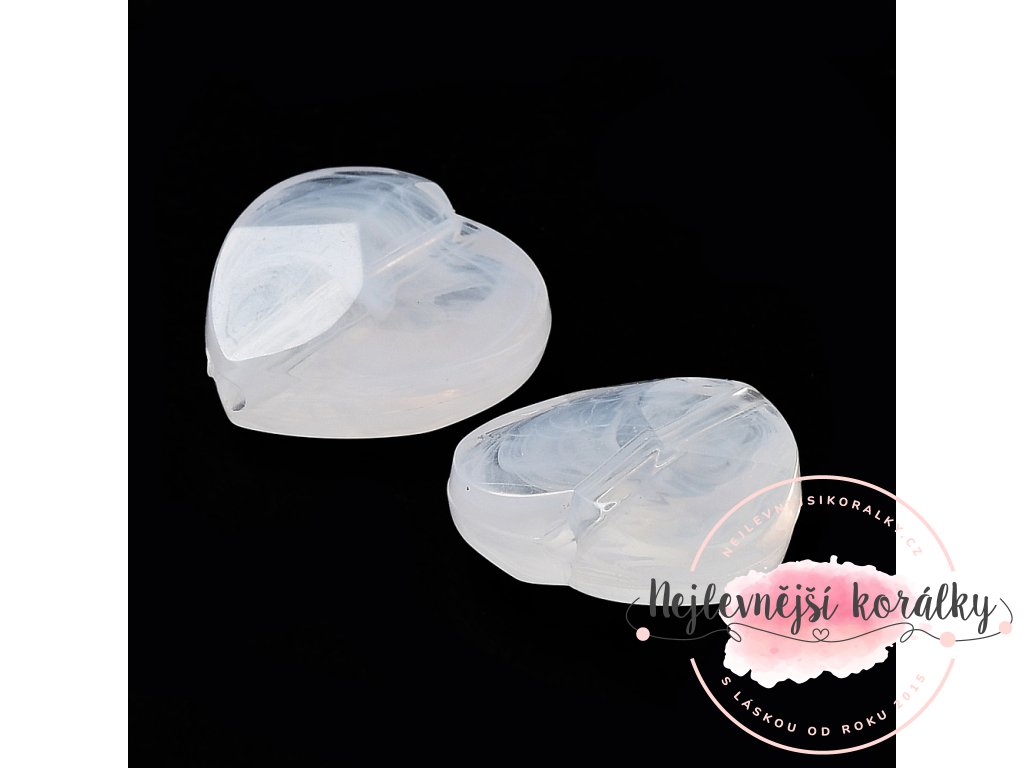 Akrylové korálky ve tvaru srdce v transparentním provedení s bílým žíháním a fasetkami.