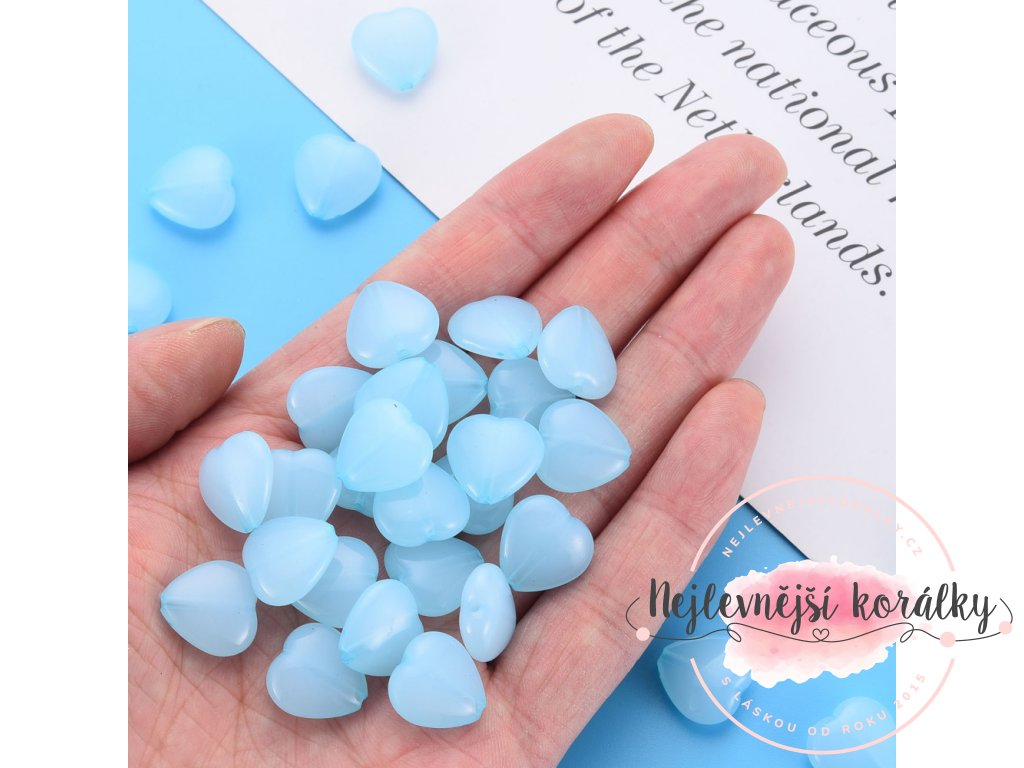 Akrylové korálky ve tvaru srdce v modrém provedení o velikosti 13,5 x 14 x 6 mm s velikostí průvleku 1,5 mm.