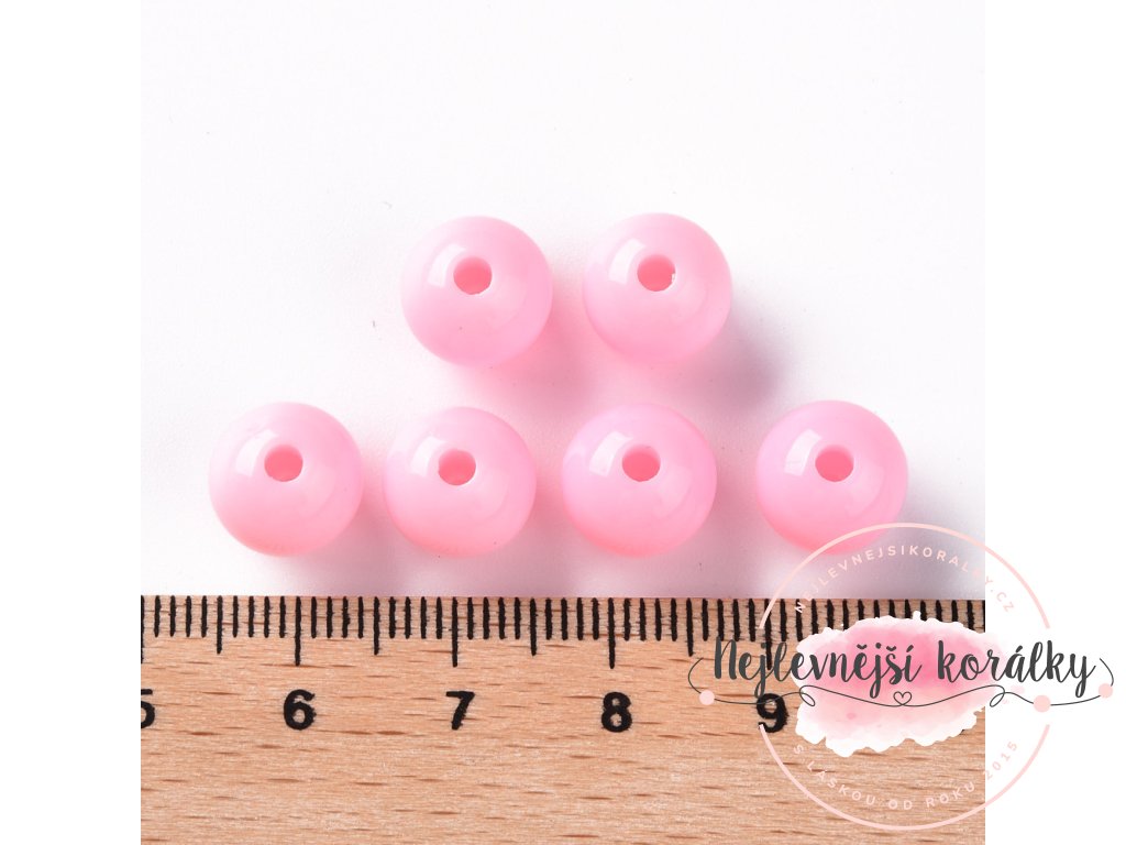 Akrylové korálky ve světle růžovém provedení o velikosti cca 10 mm s velikostí průvleku cca 2 mm.