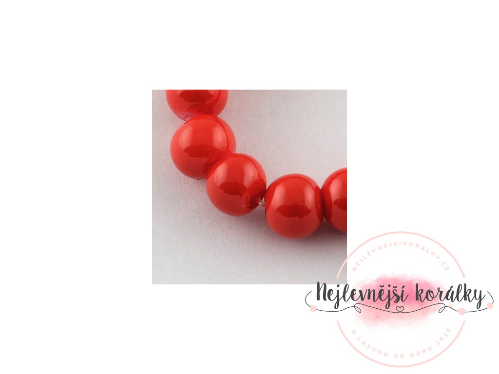 Skleněné korálky v červeném provedení o velikosti 8 mm s velikostí průvleku 1,3 ~ 1,6 mm.